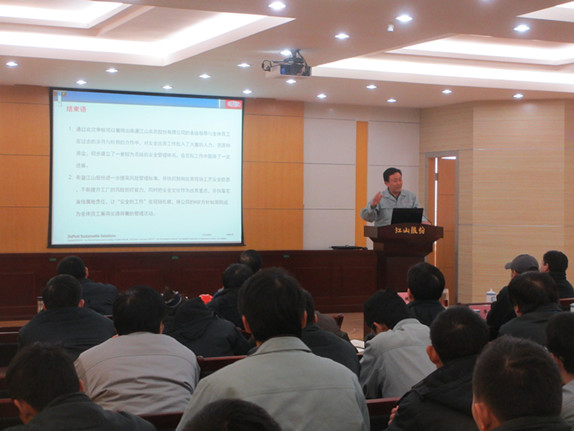 12月12日下午,杜邦安全改善项目年度审核末次会议在江山股份西区6号会议室召开。该公司总经理薛健发表重要讲话。 12月8日至11日,杜邦审核老师对我公司杜邦安全改善项目进行阶段性审核。本次审核依据的是杜邦安全管理系统的行为安全(安全文化机制)和工艺安全(风险管理机制)22要素审核清单。审核老师主要通过访谈、查阅、观察三种方法了解公司当前的HSE管理现状,并进行审核评分。