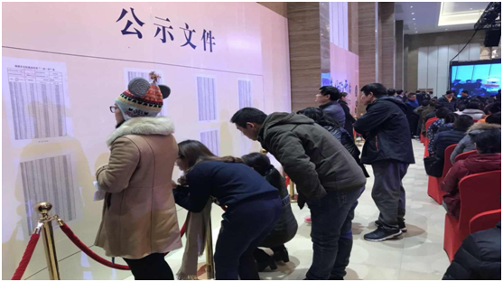 冬日清晨的微微凉意依旧挡不住客户排队抢房的热情,在工作人员的有序引导下,客户进场有条不紊。为了确保公平公正,本次开盘由乒乓球摇号+公证处公证的形式进行,全程监控录像现场直播。