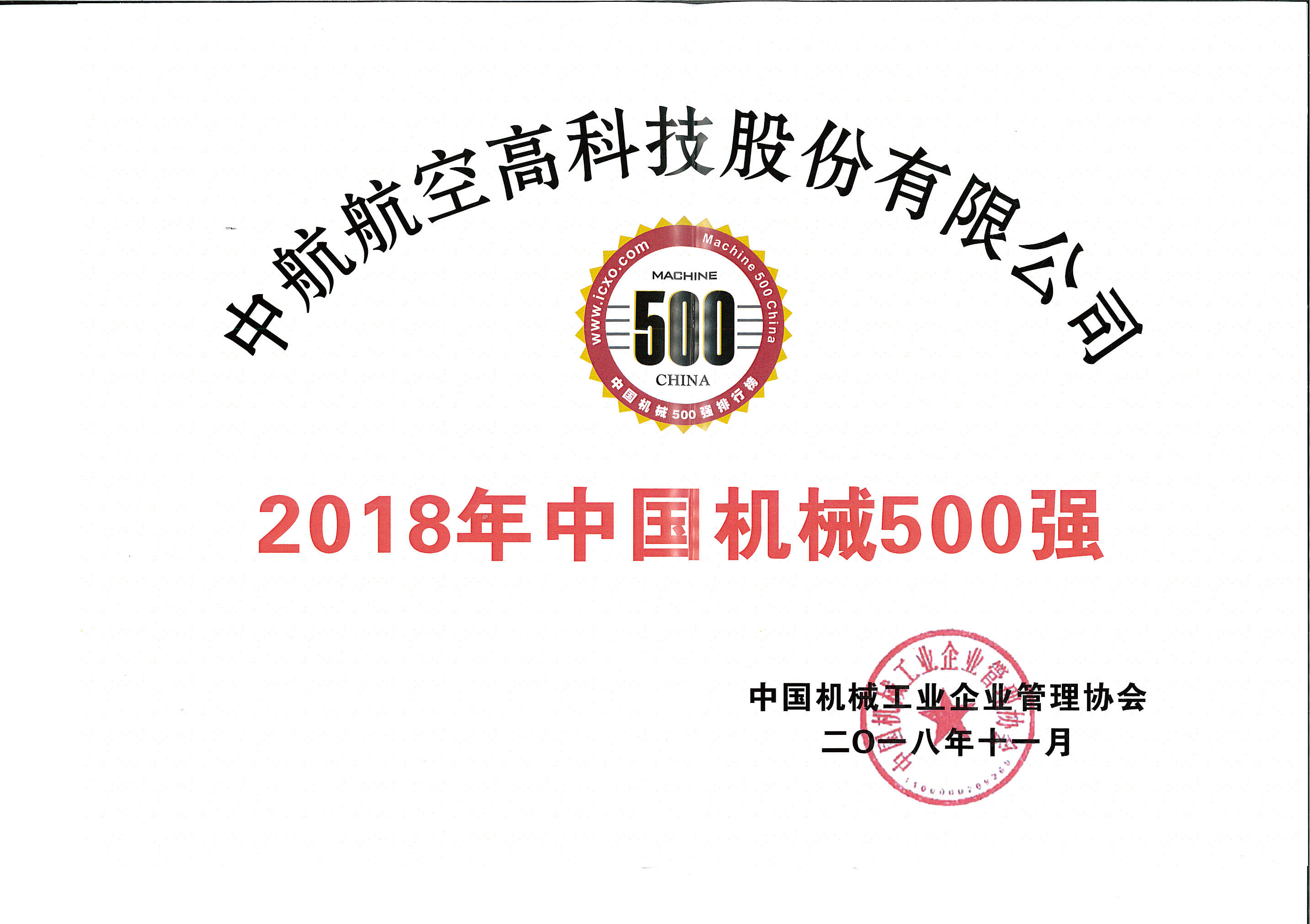 中航高科荣获“中国机械500强”荣誉称号