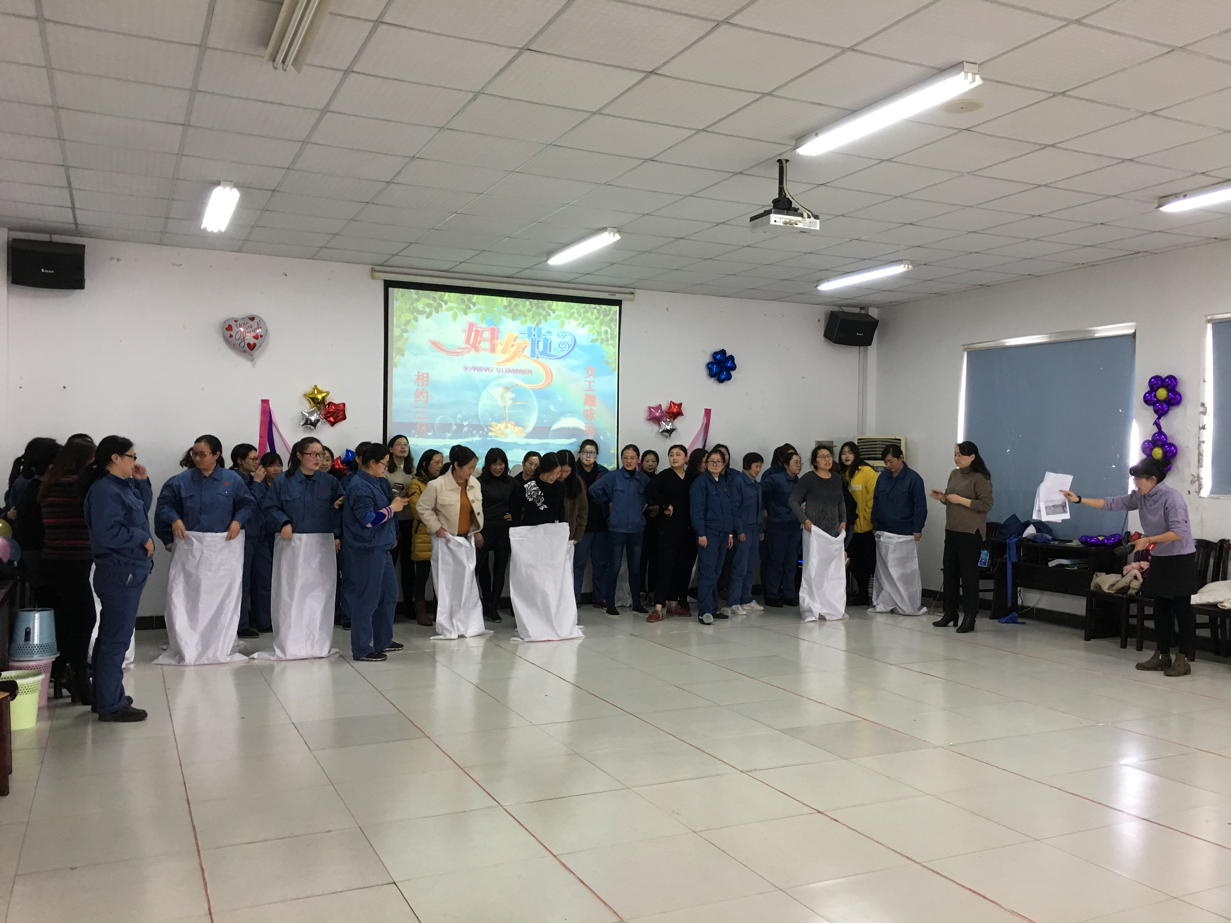 庆祝广大女性的节日,欢度第103个“三•八”国际妇女节,激发女工积极向上、努力工作的精神风貌、提高女工凝聚力与团队合作精神,丰富女工的文化生活,江苏宝灵化工股份有限公司工会于3月8日下午在食堂二楼大教室成功举办了“相约三月·女工趣味运动会”。运动会设置了三人四足、袋鼠跳接力赛、双人夹球接力跑、沙包投准、夹玻璃弹珠接力等五个项目,采取以小组为单位、团体赛的方式按总得分决出优胜组。女职工们踊跃报名,比赛时全情投入,分秒必争,默契配合,期间有人即使摔倒也顾不上疼痛立刻爬起继续奔跑,仿佛一下又回到了年少青春时期的校园赛场。此起彼伏的加油声,你争我赶的汗水,开怀舒畅的笑容,此时的赛场已完全沉浸在欢乐的海洋!