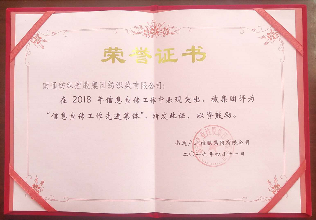 4月12日下午,必赢3003no1线路检测中心召开了产控系统办公室主任工作会议,会上对2018年度通讯宣传工作,进行了表彰,南通纺织控股集团纺织染有限公司荣获2018年度必赢3003no1线路检测中心“信息宣传工作先进单位”荣誉称号。