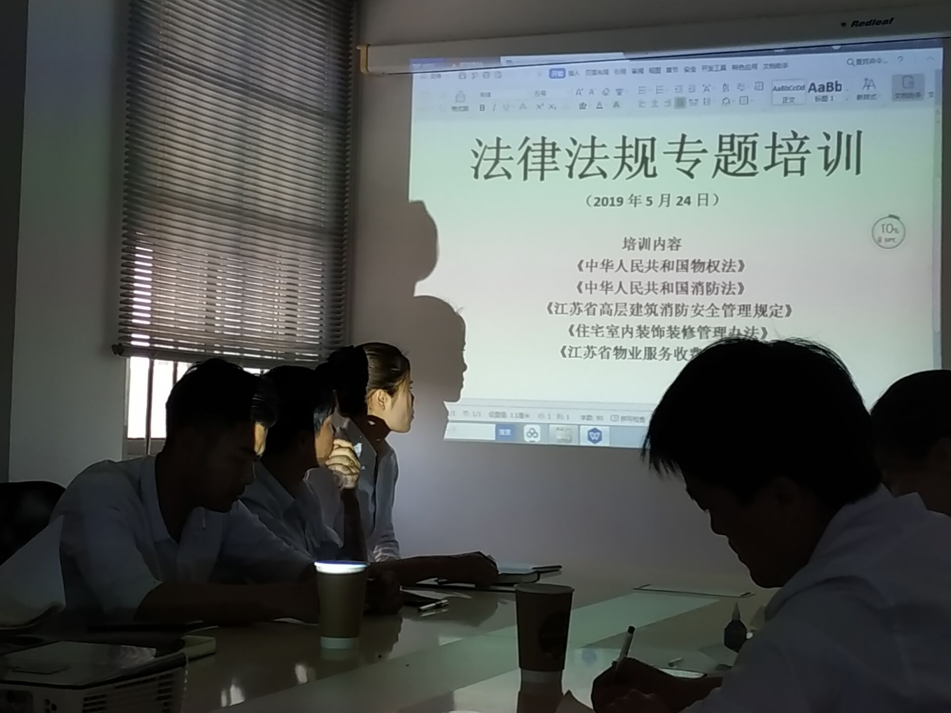 本次培训的内容主要有:《中华人民共和国物权法》、《中华人民共和国消防法》、《江苏省高层建筑消防安全管理规定》 《住宅室内装饰装修管理办法》 《江苏省物业服务收费管理办法》等五部法律法规。