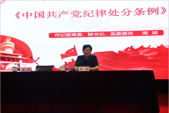 为全面贯彻习近平新时代中国特色社会主义思想和党的十九大精神,对全面从严治党、加强纪律建设作出再部署,充分发挥党纪法规标本兼治利器作用,切实加强以党员干部为重点的全社会廉洁教育,5月27日下午,市纪委常委、秘书长、监委委员周斌以“守纪律 讲规矩”为主题,深入解读《中国共产党纪律处分条例》,上了一堂生动的专题讲座。南通产业技术研究院及下属公司全体人员、陆洪社区党员代表、园区入驻企业党员干部等参加了活动。