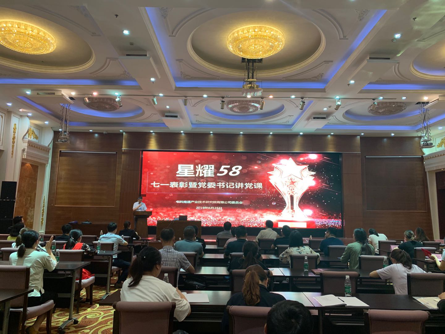 6月26日,为表彰先进、弘扬正气,做好“不忘初心,牢记使命”主题教育活动,在建党98周年,建国70周年之际,南通产业技术研究院隆重举办了2019年度“七一”表彰大会暨党委书记上党课活动。产研院、先进院全体人员、园区企业部分党员代表参加了会议。