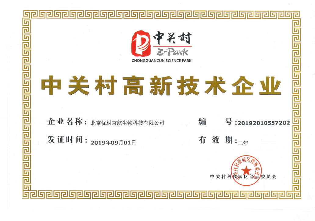 9月1日,中航航空高科技股份有限公司全资子公司北京优材京航生物科技有限公司荣获“中关村高新技术企业”证书。该证书的获得为优材京航打造创新型企业带来了新的机遇,使公司更加重视创新发展。