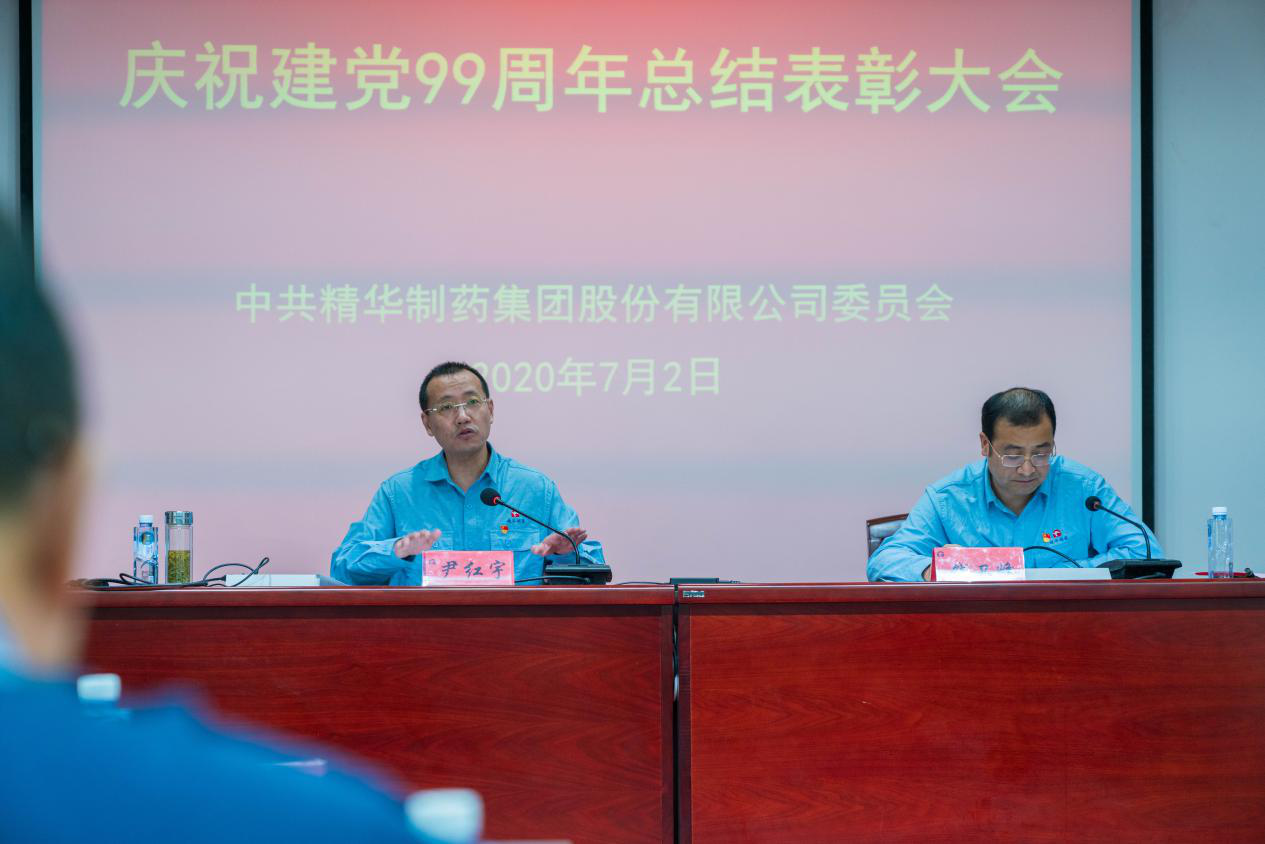 会议表彰了优秀党务工作者、优秀共产党员和“精华四问”主题征文活动获奖个人,组织了新老党员宣誓仪式和党员政治生日活动,两名党员代表宋小军、王秀梅作了交流发言。 集团党委书记、董事长尹红宇带领大家回顾了党的光辉历程,简要总结去年以来党建工作的开展情况和全面从严治党工作取得的成绩。他指出全面从严治党工作是一项极端重要的工作,要旗帜鲜明抓好党建引领经济工作,祛除党建和经济“两张皮”的病垢。他强调市委市政府对精华的发展寄予厚望,新的形势需要进一步加强并创新党建工作,要求全体党员干部要从珍惜当前精华制药发展的机遇,直面挑战,重新审视自己如何更好地匹配工作岗位两个维度,做到“葆有初心、务实奋进;答好“四问”,团结拼搏;建好队伍,创新开拓”,以“成功不必在我的心境,功成必定有我的担当”,一鼓作气、一以贯之,为精华的高质量做出应有的贡献。