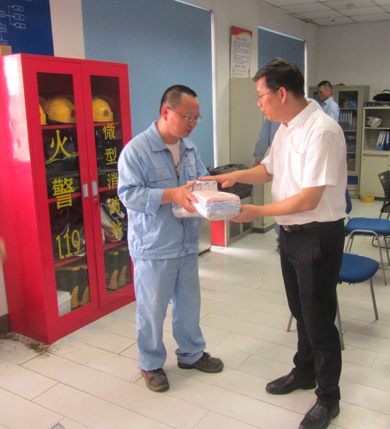 近日持续高温, 8月18日下午,必赢3003no1线路检测中心董事长张剑桥前往江山农化、江天化学、醋酸化工等企业慰问坚守生产岗位的一线职工,送去毛巾、藿香正气液、仁丹、风油精等防暑降温物资。