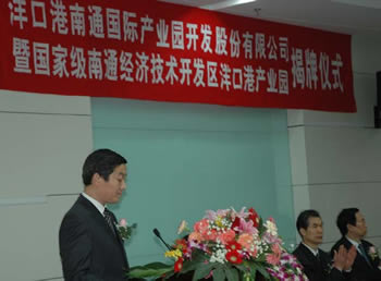 集团董事长、洋口港南通国际产业园开发公司董事长陈照东在仪式上致辞。他指出,作为南通国际产业园建设的运作平台,新公司将根据国家产业政策导向和洋口港建设开发总体规划,结合全市产业结构调整战略,充分发挥市开发区的招商优势和市级国资公司的融资优势,加快开发建设步伐;要坚持快节奏启动、高起点规划、大力度招商、规范化运作,努力将南通国际产业园建设成国有资本积聚、新兴产业特色鲜明的工业园区,做到“一年一个样、三年大变样”,为全市大港口、大园区、大产业战略贡献力量。