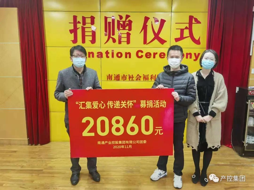 经过前期积极动员,集团各级团组织的团员青年广泛参与,纷纷献出爱心,活动共募集捐款20860元。 11月27日上午,集团团委书记严律、副书记朱安琪代表集团团委前往南通市福利院,将募集捐款全额捐赠给市福利院,并转达了集团团员青年们对孩子们的深切祝福。市福利院党委书记吴向华参加捐赠仪式,并对集团团委的爱心捐助表示感谢。