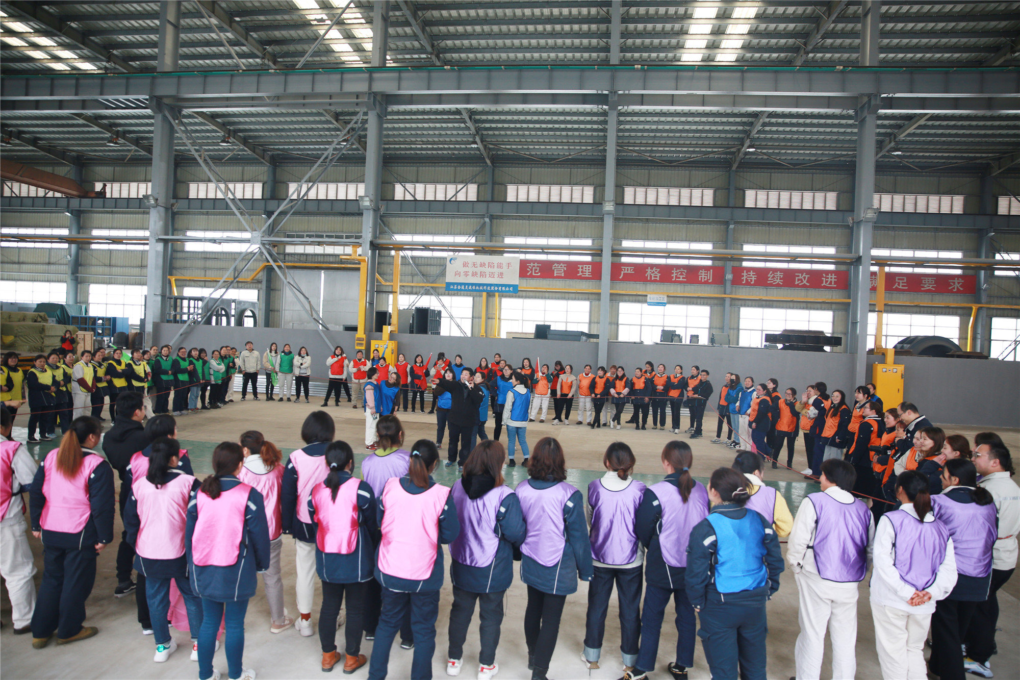 3月8日下午, 一百多名女职工欢聚2号车间,在教练的带领下,分成了10个小组,按照要求分别设计了自己队的队名、队徽、口号、队歌,并依次展示了团队风采。在充满乐趣的热身小游戏后,便开始了“坦克大战”、“环游世界球”、“动力绳圈”等团队拓展项目。在彼此信任、相互沟通、集体协作的氛围中,各小组成功完成了此次拓展任务。参加此次活动的广大女职工们有长期伏案的科员,有奋战一线的工人,也有集团中高层领导,在新组建的团队中,大家抛开身份,融入队伍,在队长的带领下,克服困难,团结一心,共同为队伍加分增光。 此次拓展活动,既缓解了女职工们工作的疲惫和压力,又增进了同事间的友谊,增强了团队凝聚力,大家在娱乐中感受到团队的力量。集团党委副书记、工会主席李建兵给女工们送上节日的祝福,他表示,广大女职工们在此次活动中充分展示了巾帼风采,彰显出金通灵女工队伍的魅力,在今后的工作中,大家要时刻握紧手中的“动力绳”,劲往一处使,力往一处用,跟着团队的步调,以奋发昂扬的姿态继续前行! |
