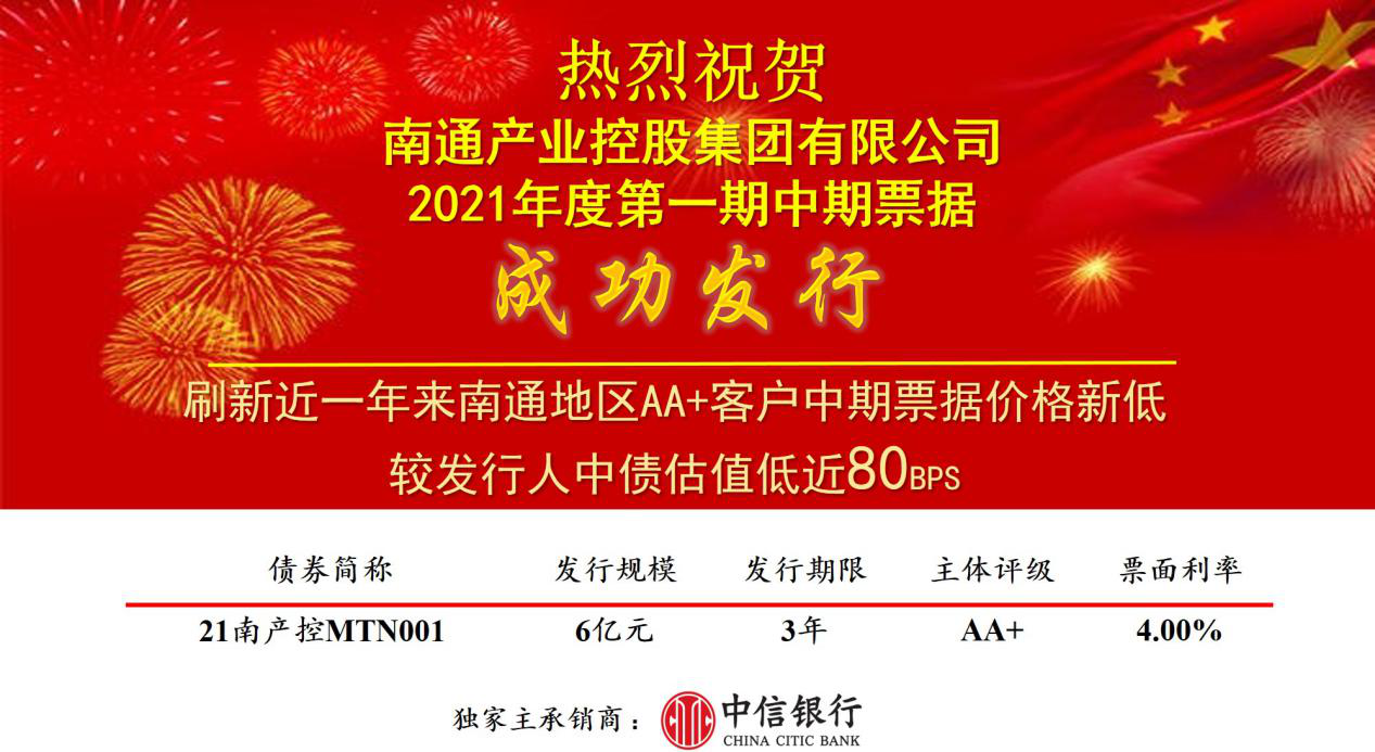2021年4月22日,必赢3003no1线路检测中心成功发行6亿元中期票据。由于必赢3003no1线路检测中心的良好资质得到投资者的认可,本期中票簿记倍数1.6倍,边际倍数1.16倍,票面利率4%,比集团三年期债券估值低近80BPS,同时创下了近一年来南通地区AA+评级中期票据价格新低。