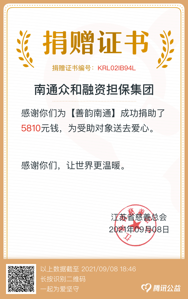 为进一步弘扬中华民族扶贫济困的传统美德,倡导“以人为本,乐于奉献”的互助精神,众和担保积极发动发动、广泛宣传,第一时间组织全体干部职工开展“慈善一日捐”活动。公司领导班子成员率先垂范,带头捐款,全体干部职工踊跃参与,奉献爱心,参与度100%。截至9月8日,共筹得善款5810元,募集资金将统一交至南通市慈善总会,用于扶贫、慈善救助项目。