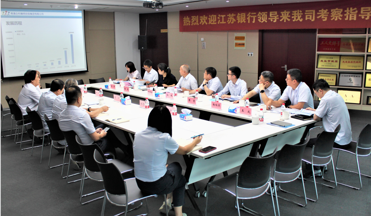近日,江苏银行总行授信审批部副总经理刘传宝一行与江苏银行南通分行相关部门负责人来众和担保进行考察调研。双方就众和担保公司发展运营情况、加强银担合作以及信贷调查技术等事项进行了深入交流和有益探讨。