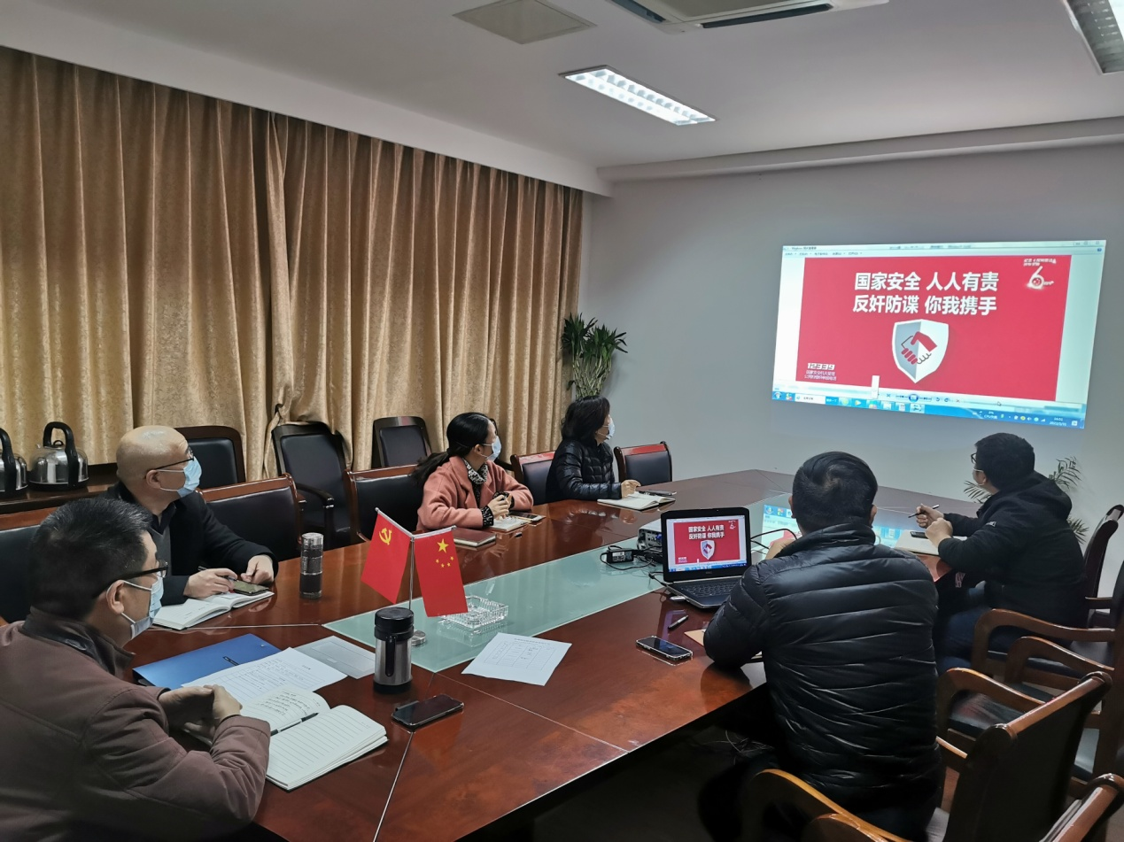 活动中,党支部书记徐森林组织干部职工学习了习近平总书记关于国家安全、国土安全的重要论述、《国家安全法》《反间谍安全防范工作规定》《江苏省反间谍安全防范工作条例》等方面的内容,并组织大家集中观看《反间谍法》宣传海报。