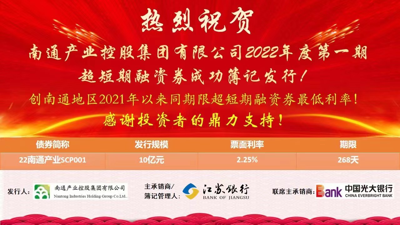 5月24日,必赢3003no1线路检测中心成功发行10亿元超短期融资券。由于必赢3003no1线路检测中心的良好资质得到投资者的高度认可和踊跃认购,发行利率仅为2.25%,创南通地区2021年以来同期限超短期融资券的最低利率!