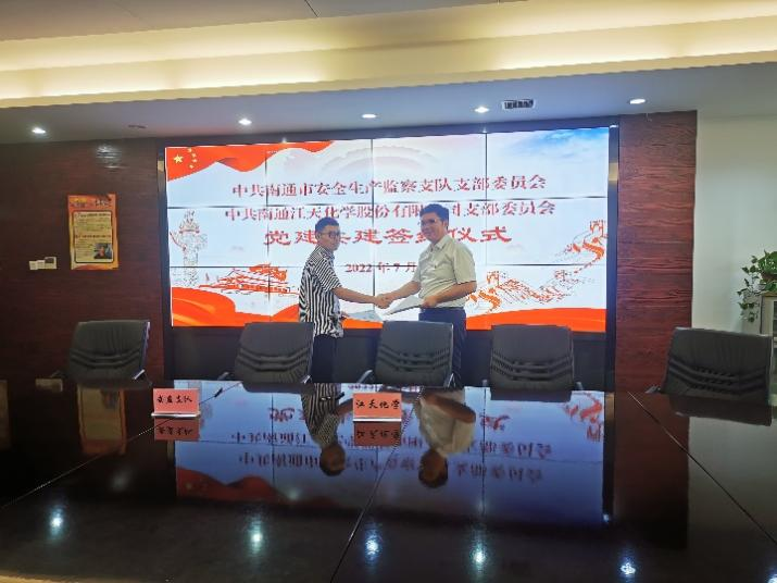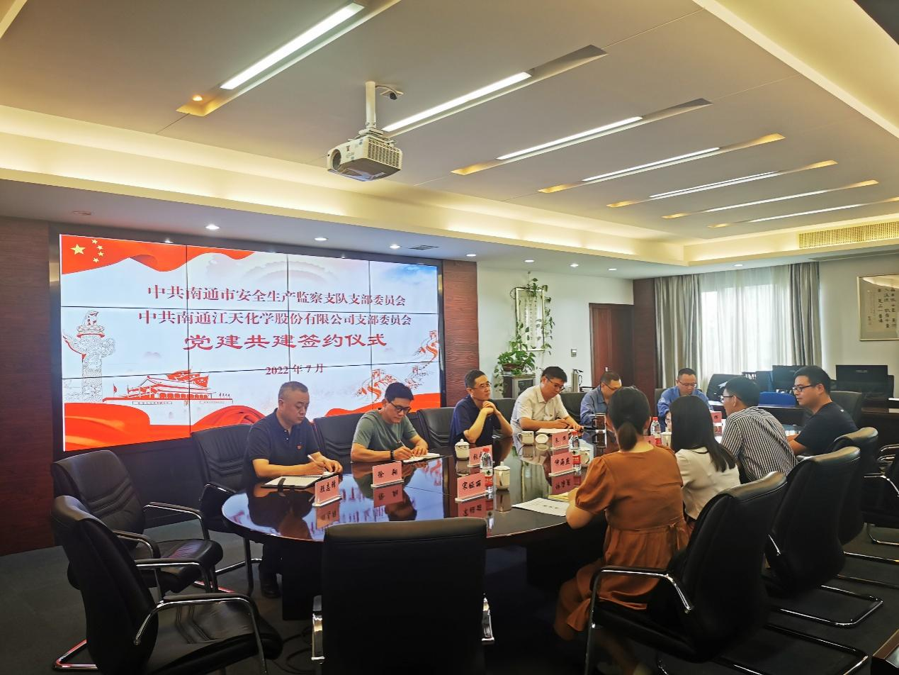 为认真贯彻落实习近平总书记关于安全生产方面的重要论述,深化“红色引领 绿色智造”党建品牌建设,深入推进融合党建实践,提升安全生产管理工作成效。7月份,江天化学党支部与南通市安全生产监察支队党支部开展了党建共建签约仪式,进一步加深合作交流,创新党建结对共建形式。