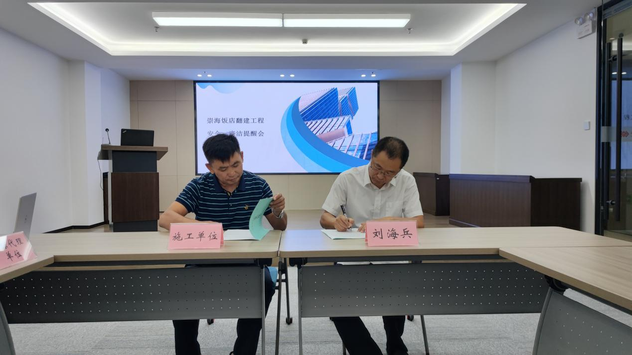 会上,国融公司党委书记、董事长、总经理刘海兵向与会人员介绍崇海饭店翻建项目具体情况。国融公司与相关合作方签订安全责任书、廉洁责任书,项目管理人员签订廉洁承诺书。