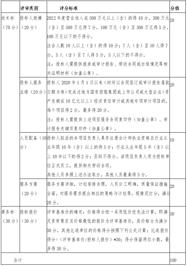 本项目采用综合评标法,由必赢3003no1线路检测中心评标小组对各投标人技术标和商务标进行综合评审和评分。评分采用百分制,按总得分(技术标得分与商务标得分之和)从高到低的顺序确定排名次序,总得分排名第一的投标人为中标人;如遇两家投标人总得分排名并列第一时,则商务标得分高的投标人为中标人;如商务标得分一致,则通过抽签方式确定中标人。技术标最终得分为所有评委评分的算术平均值,评分值均保留至小数点后两位。 具体评分标准如下: